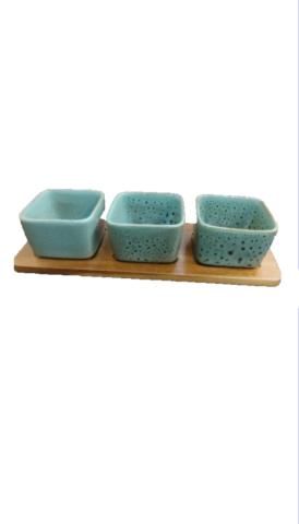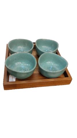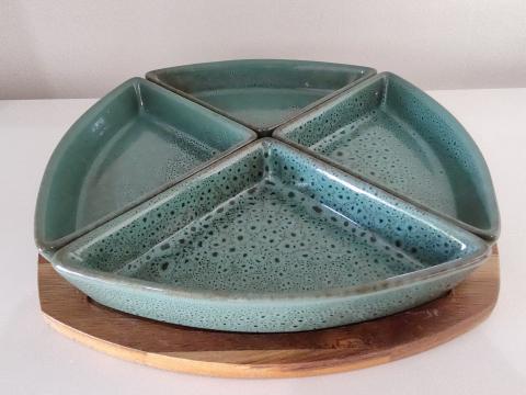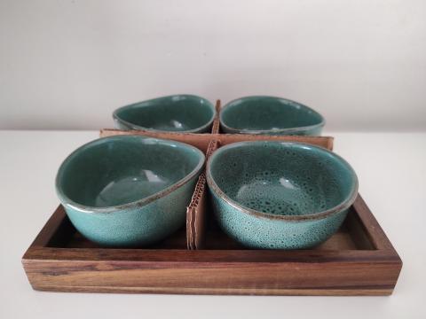 PETISQUEIRA EM MADEIRA E CERAMICA VERDE COM 4 BOWLS